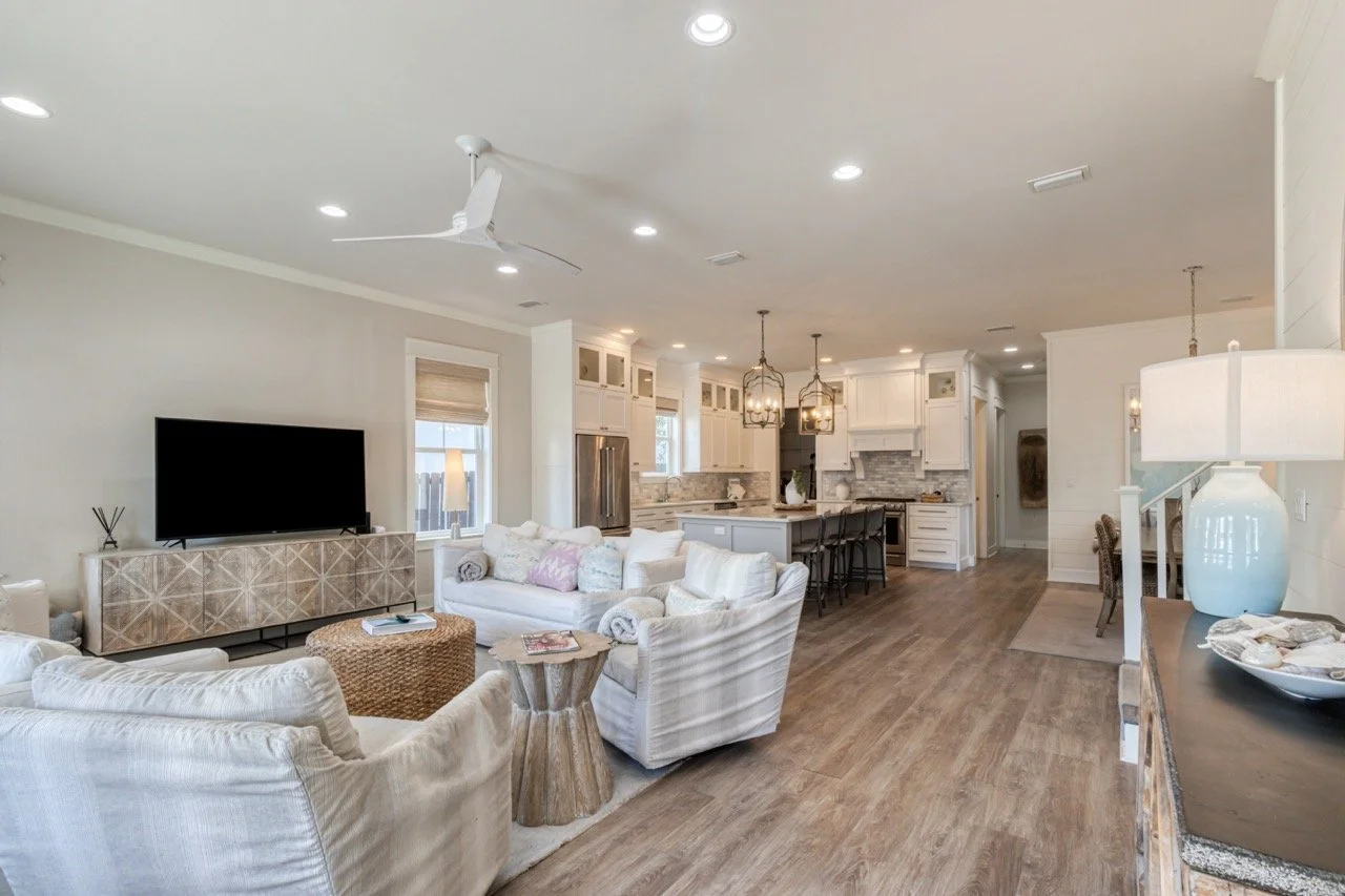 Enjoy a bright living area with a 75” Smart TV, a fully equipped kitchen, and a third-floor balcony. Steps from 30A beaches, dining, and shops!